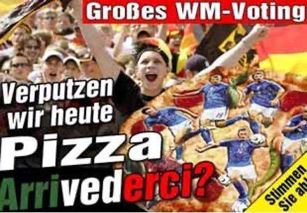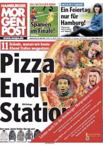 这并非意大利足球第一次被外国媒体用这样的方式解读。2006年世界杯和2012年欧洲杯,德国人两次遭遇来自阿尔卑斯山脉南麓的宿敌,一些当地报纸打出“再见披萨”的标题,并在披萨饼上放了意大利球员的形象,只是两次笑到最后的都是穿蓝衣的一方。当然,这或许只是属于德国人和德国媒体的一种幽默,他们已经习惯了用杂志封面上的讽刺漫画,调侃不靠谱的贝卢斯科尼。